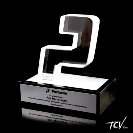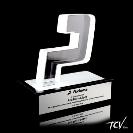 Logo "P" Paclease recortado cantos satinados sobre base de madera iluminada.