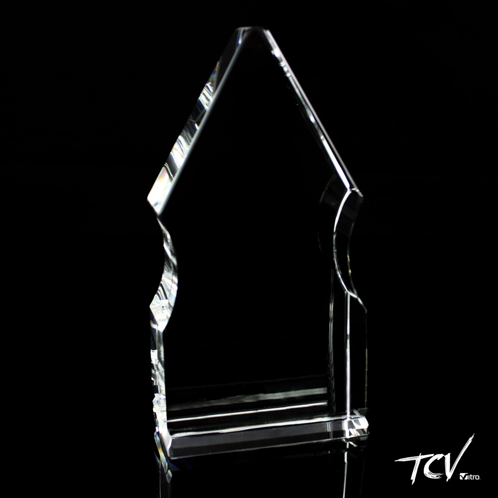 Trofeo vertical con curvaturas y terminación en punta, cortes diamante en la parte inferior.