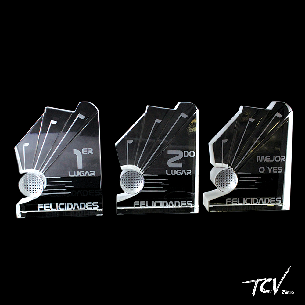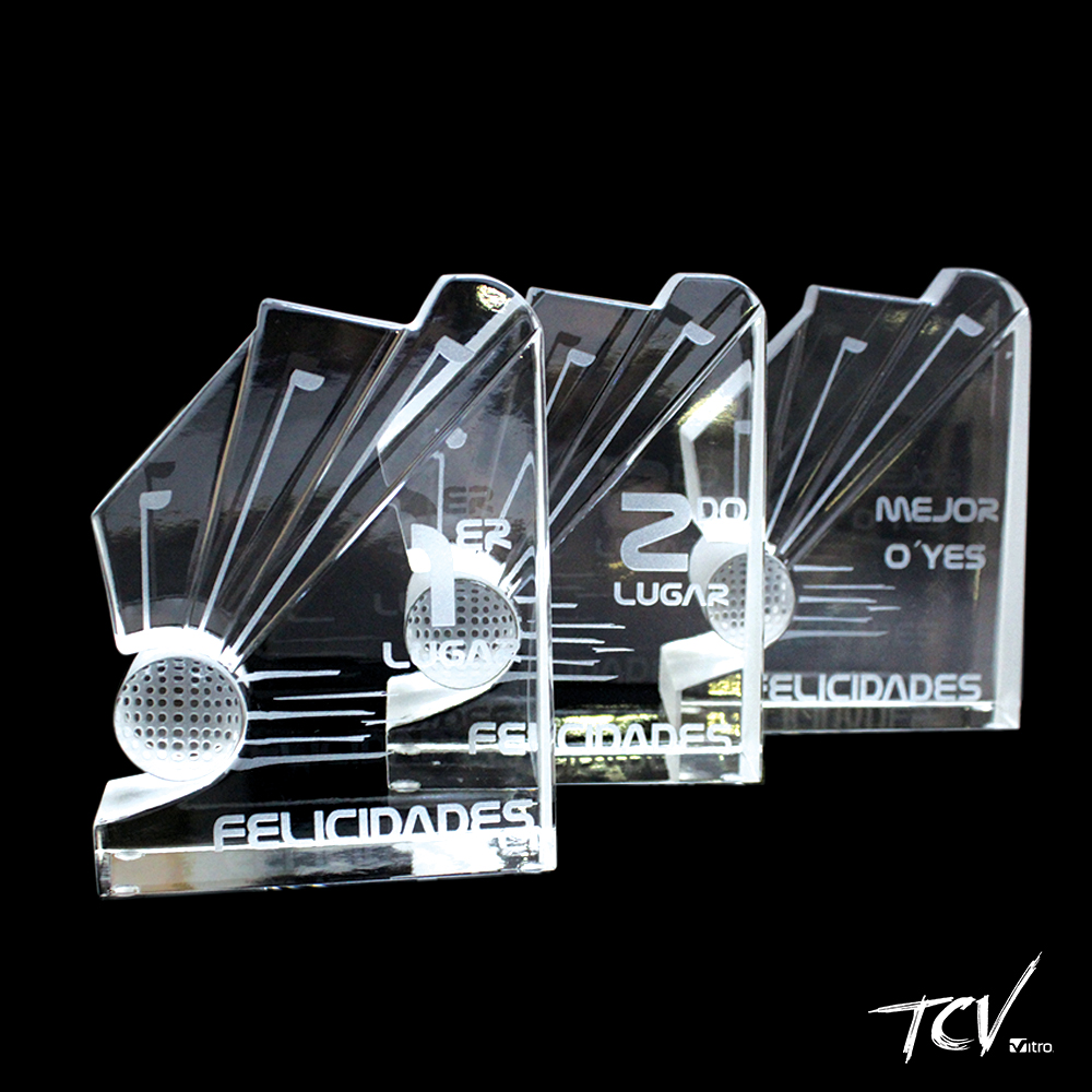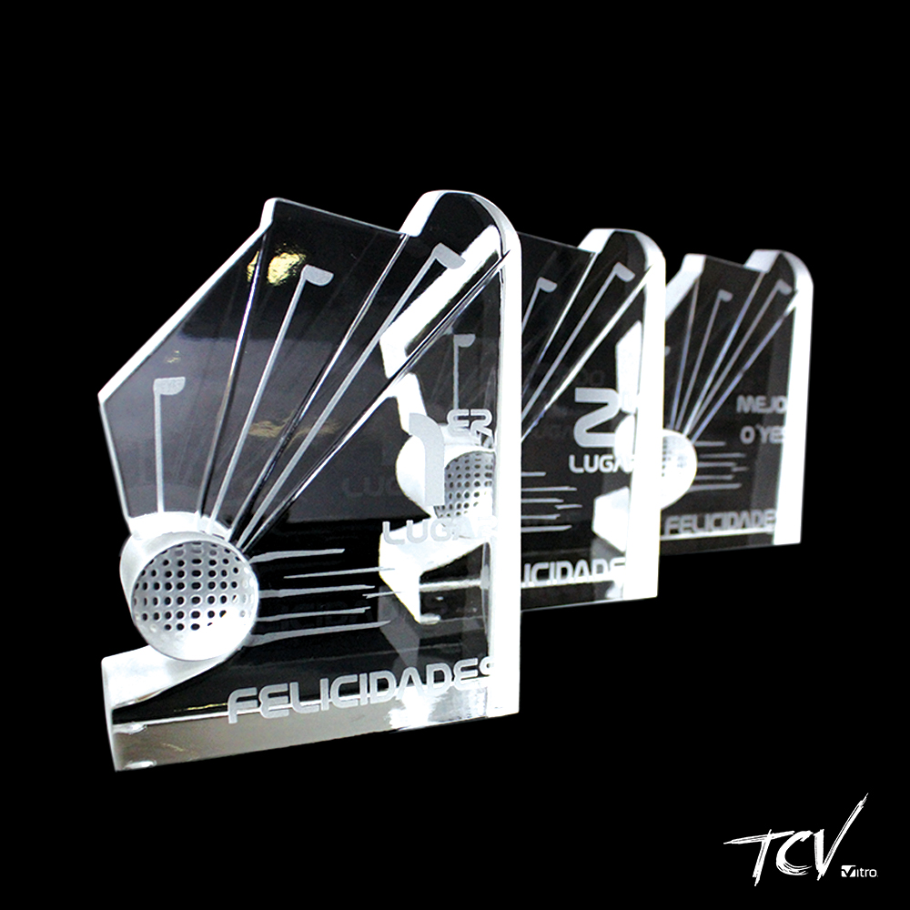 Placa crest con cortes diamente, faceta y grabados, todo ello al frente, con una perforación la cual lleva incrustado un cilindro que representa la bola de golf. Este diseño expresa el dinamismo de un «swing» hasta el momento donde golpea la bola.