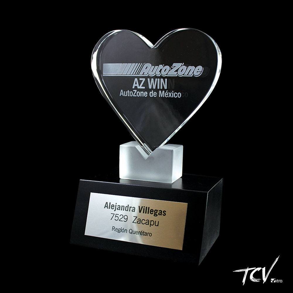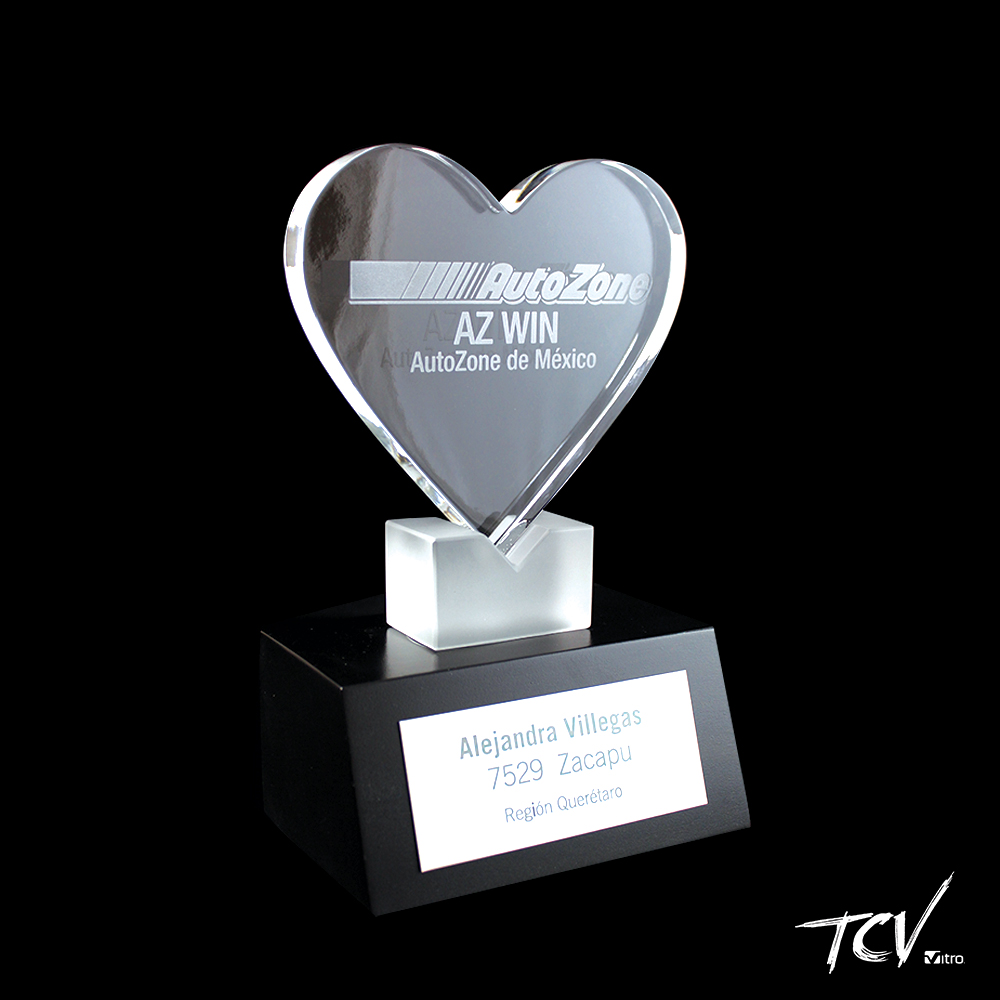 Elemento de cristal con forma de corazon grabado a traves de, sobre un elemento de cristal satinado, montados en una base de MADERA