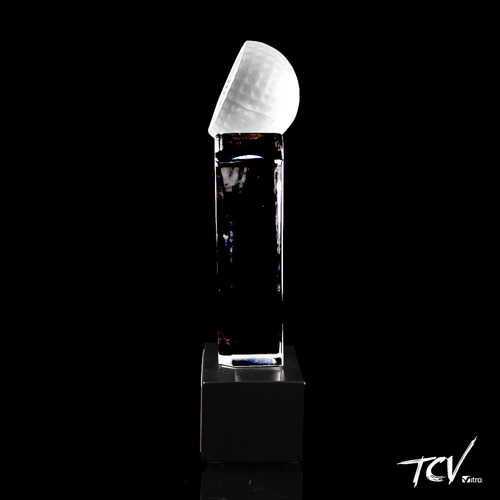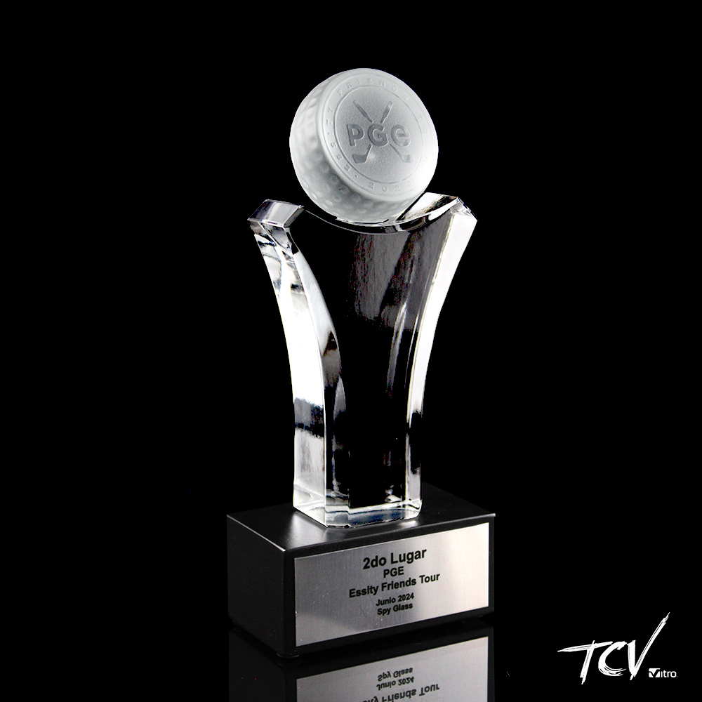 Trofeo que simula el cuerpo del golfista con pelota de golf satinada en la parte superior, elemento intermedio cristalino con facetas y base rectangular de madera color chocolate y placa metálica.