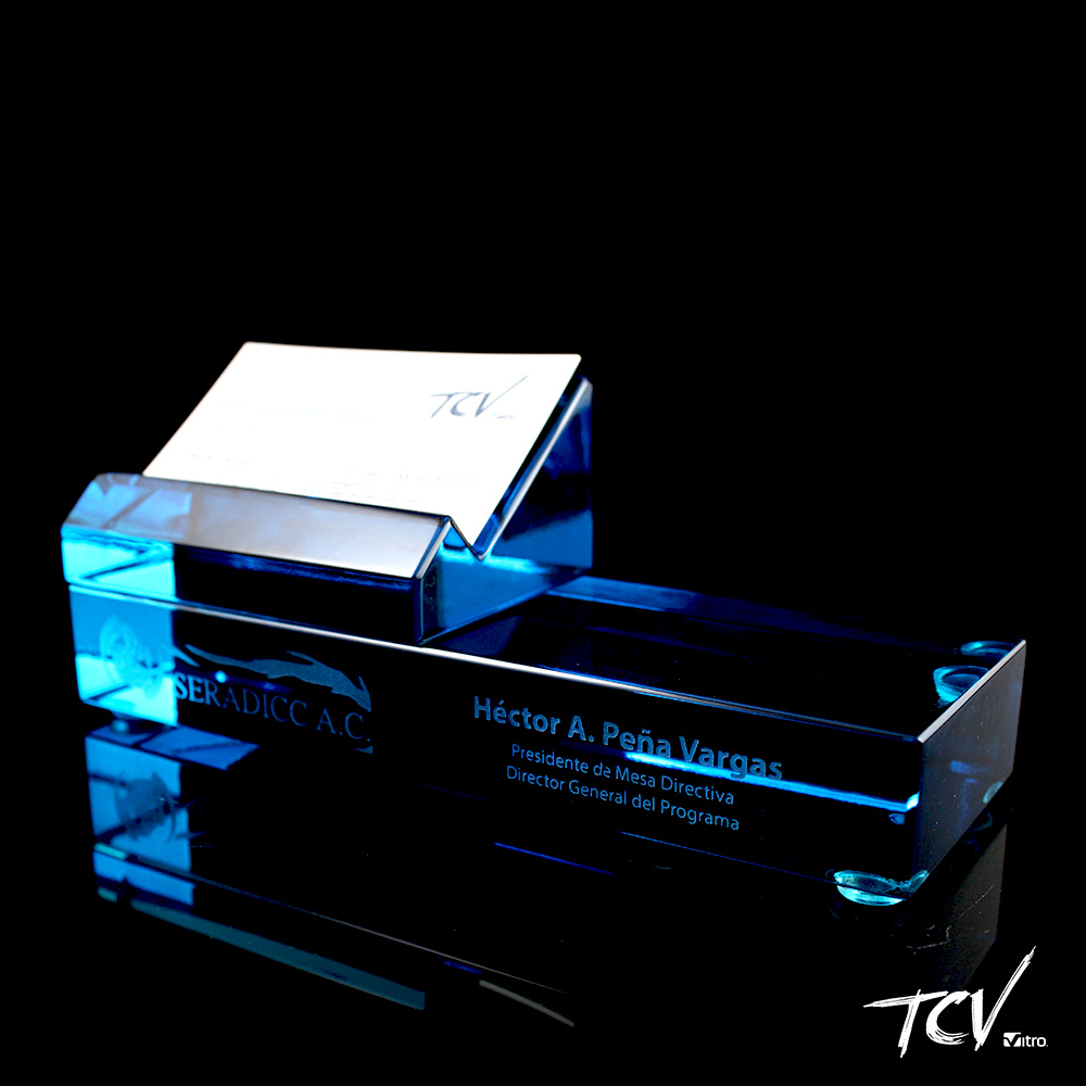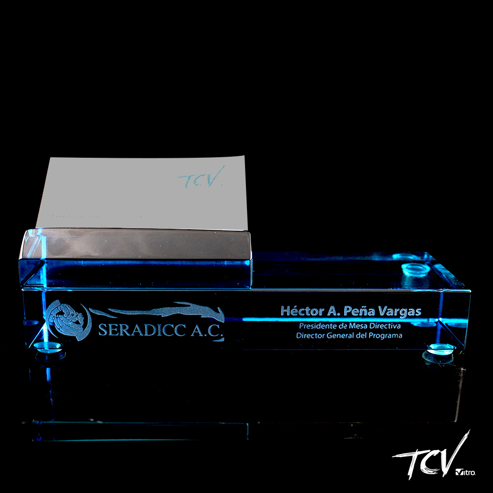 Personalizador y tarjetero en cristal aqua con grabado al frente