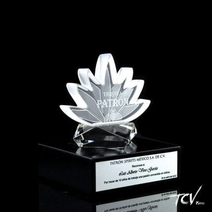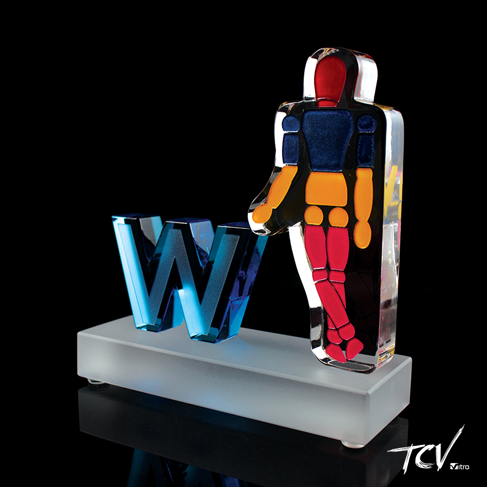 Letra W en volumen en cristal aqua con silueta de dibujo the Boss grabado al frente con aplicacion de 4 colores de pintura sobre base rectangular en cristal satinado