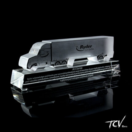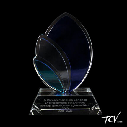 Placa leaf cristalina grabado al frente con elemento curvo en cristal amarillo sobre base rectangular satinada
