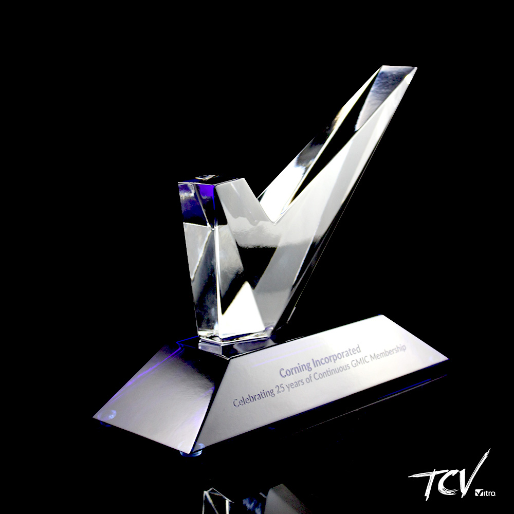 Pieza de cristal brillante con facetas al frente sobre base piramidal de cristal azul oscuro con area de grabado.
