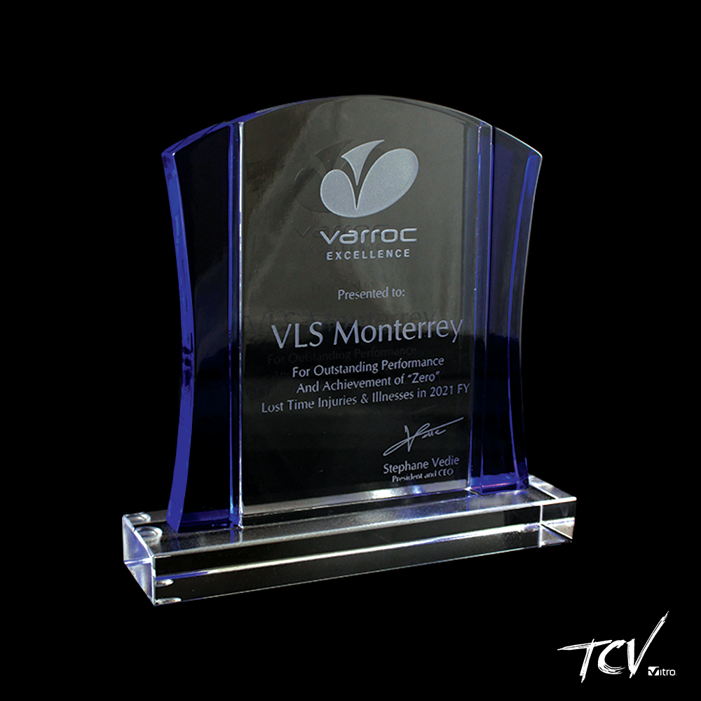 Rec. compuesto por 3 elementos que simulan la pieza Sencillez 2 elementos son cristal azul oscuro a los lados y el del centro cristalino, todo sobre base rectangular cristalina.