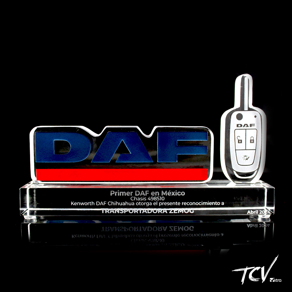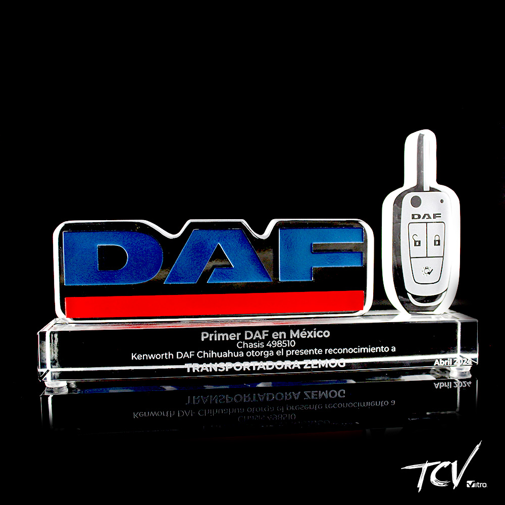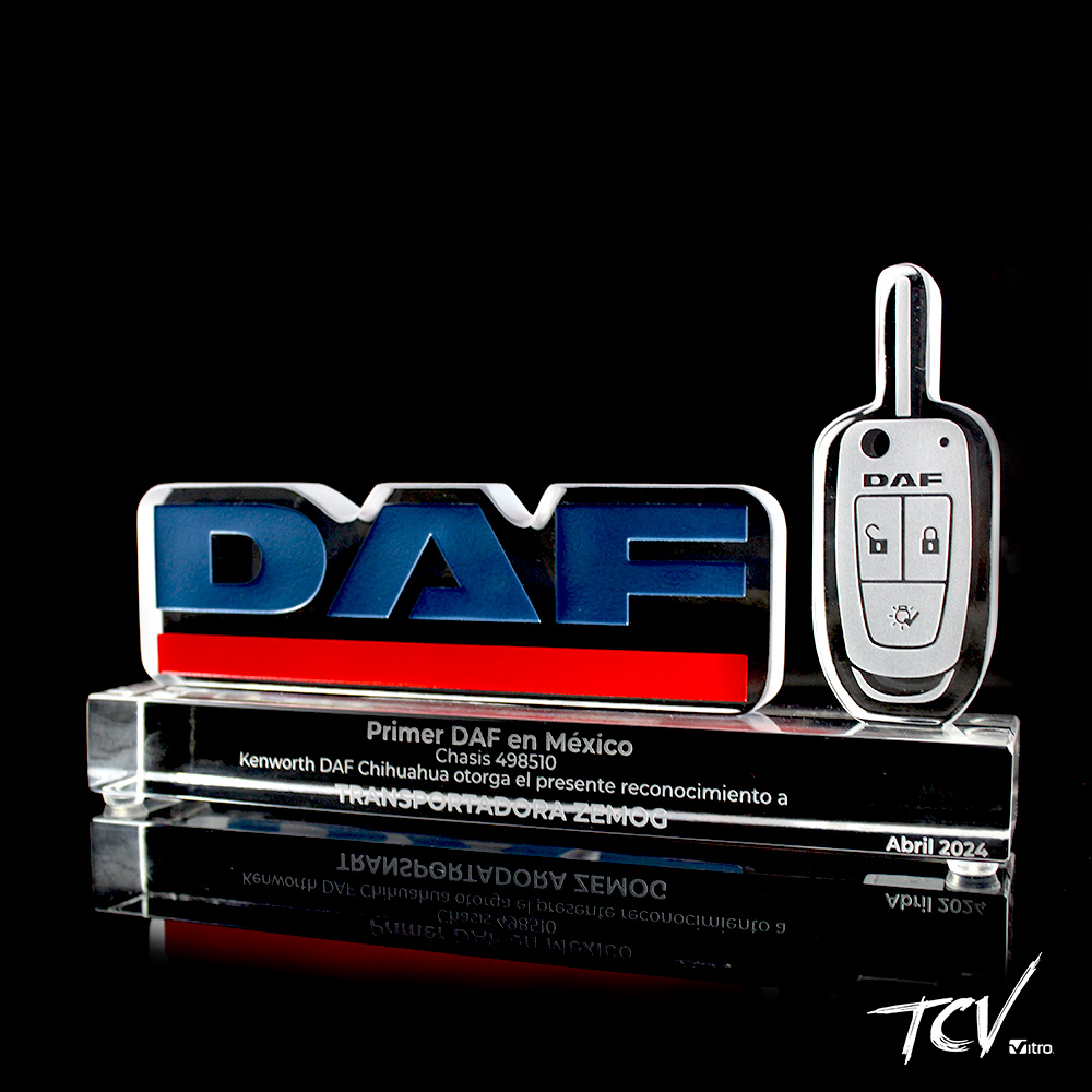 Logo de cristal recortado en placa transparente grabado al frente con aplicación de pintura sobre base rectangular de cristal brillante.