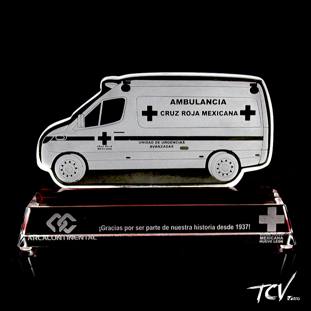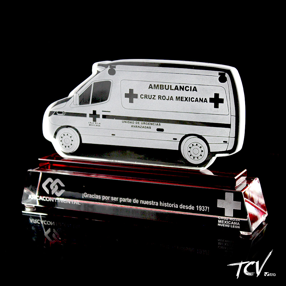 Silueta de cristal grabado al frente sobre elemento intermedio de cristal rojo sobre base piramidal de cristal transparente.