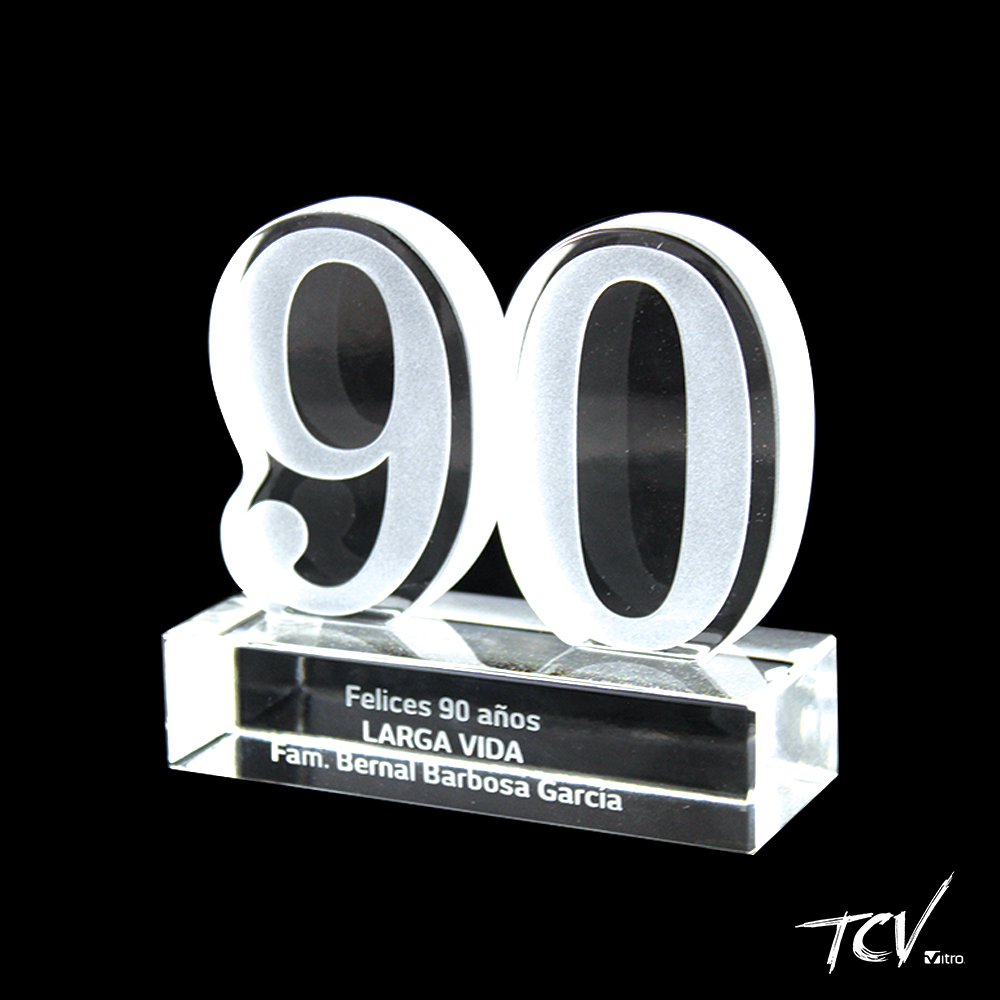 Silueta de cristal grabado al frente con cantos opacos sobre base rectangular de cristal