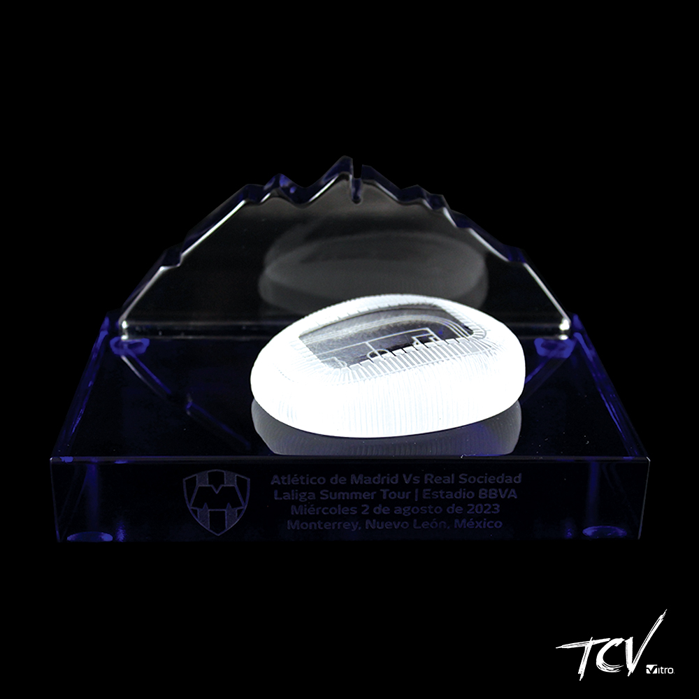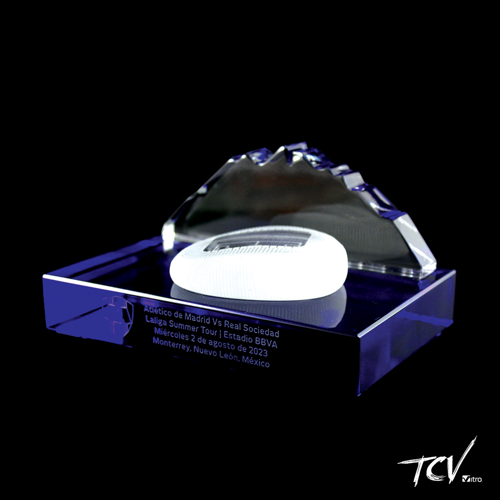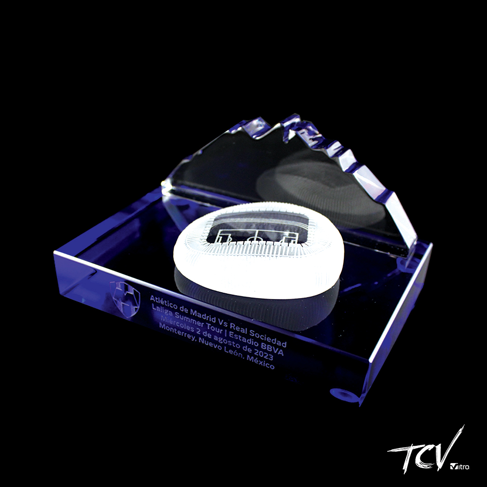Silueta del cerro de la silla con una replica del estadio bbva en la parte de enfrente sobre base de cristal azul oscuro grabado al frente
