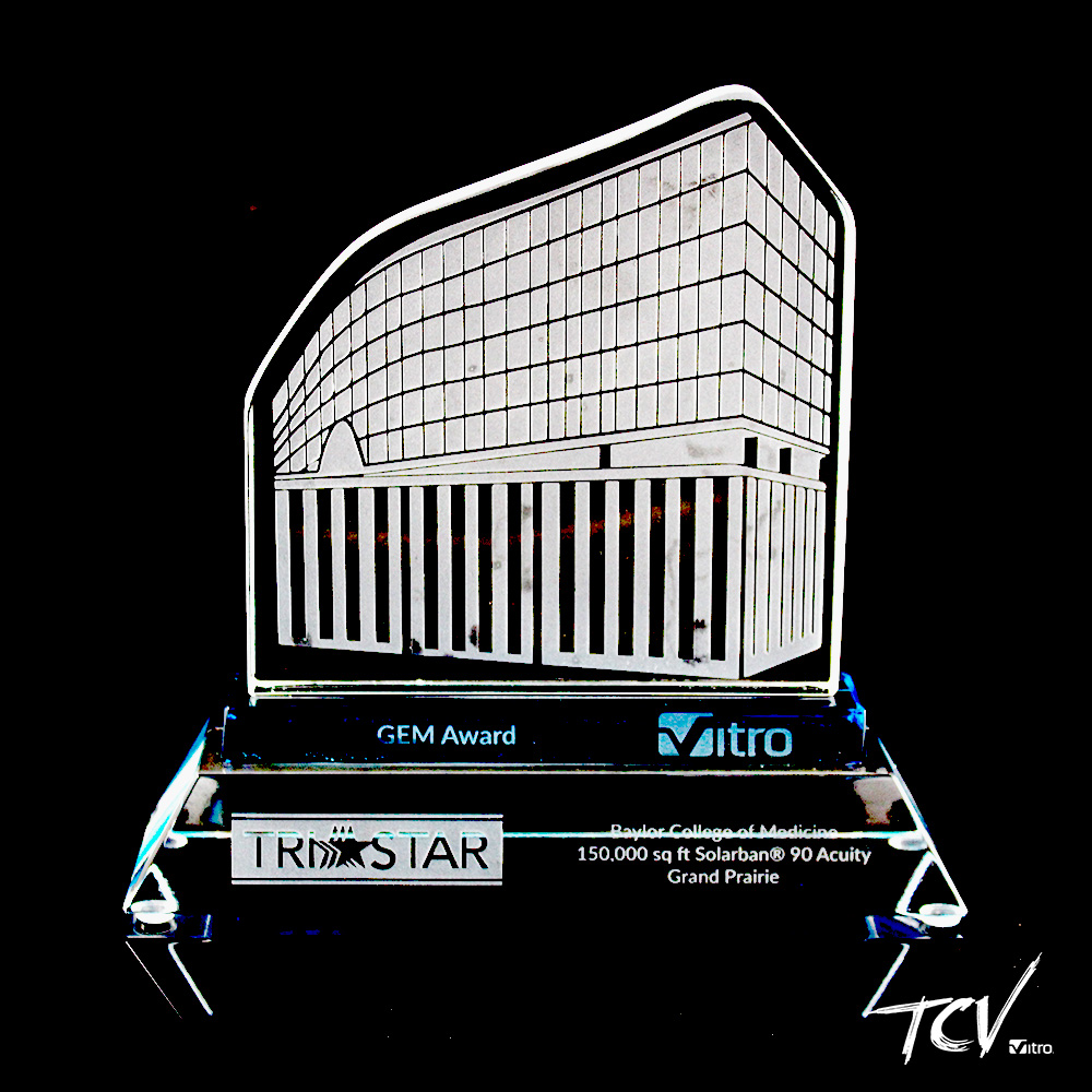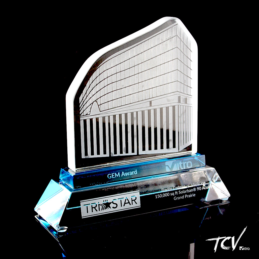 Silueta de cristal grabado al frente sobre una base rectangular de color aqua y una piramidal de cristal transparente con grabado al frente.
