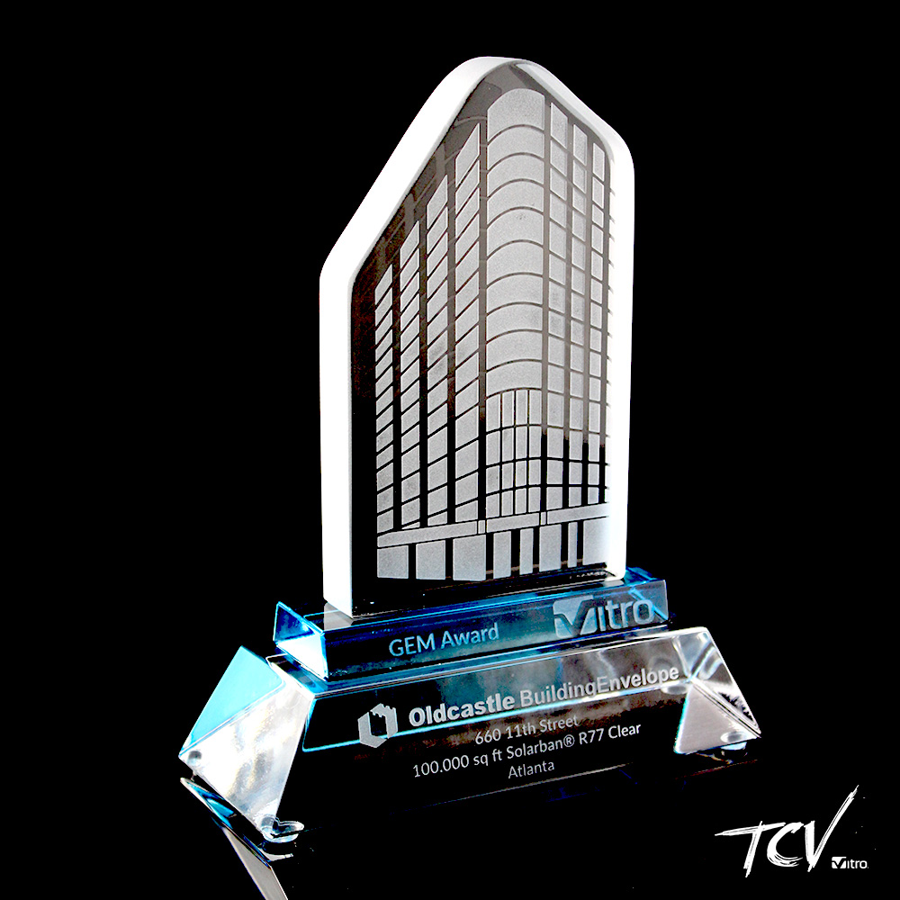 Silueta de cristal grabado al frente sobre una base rectangular de color aqua y una piramidal de cristal transparente con grabado al frente.