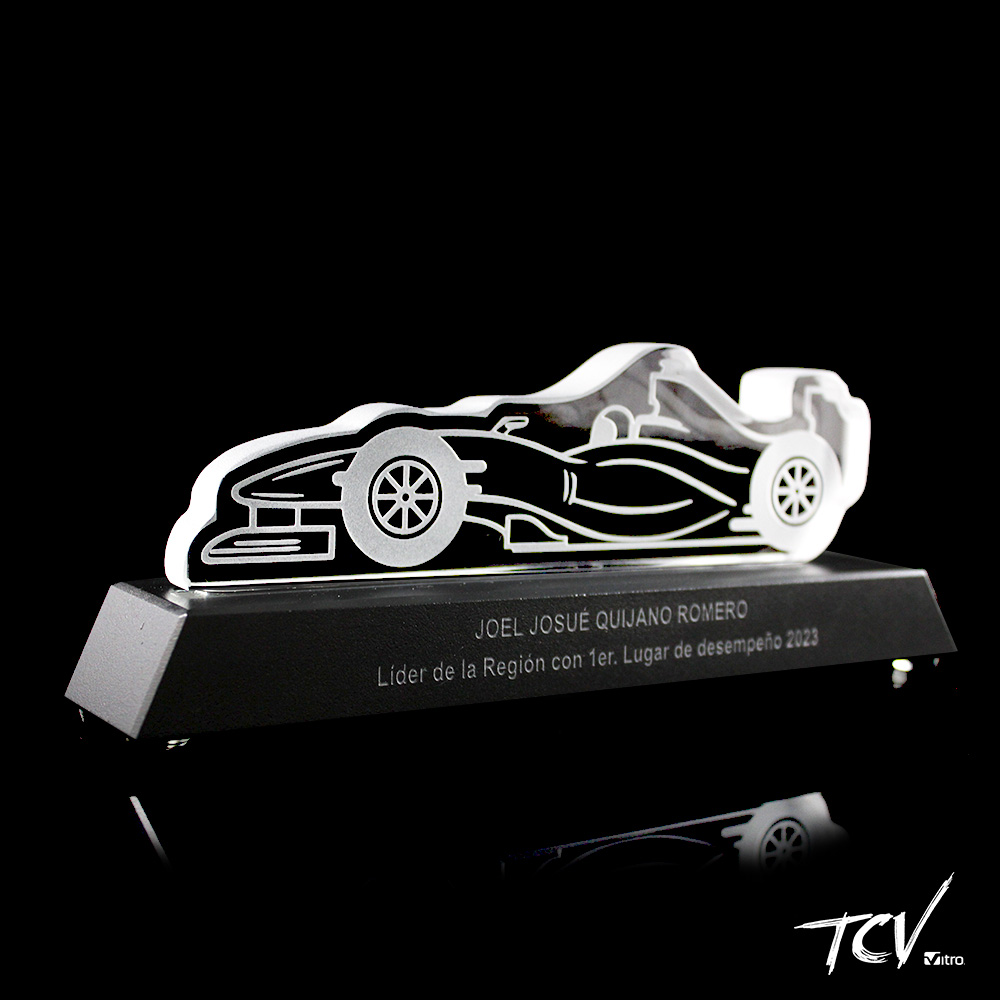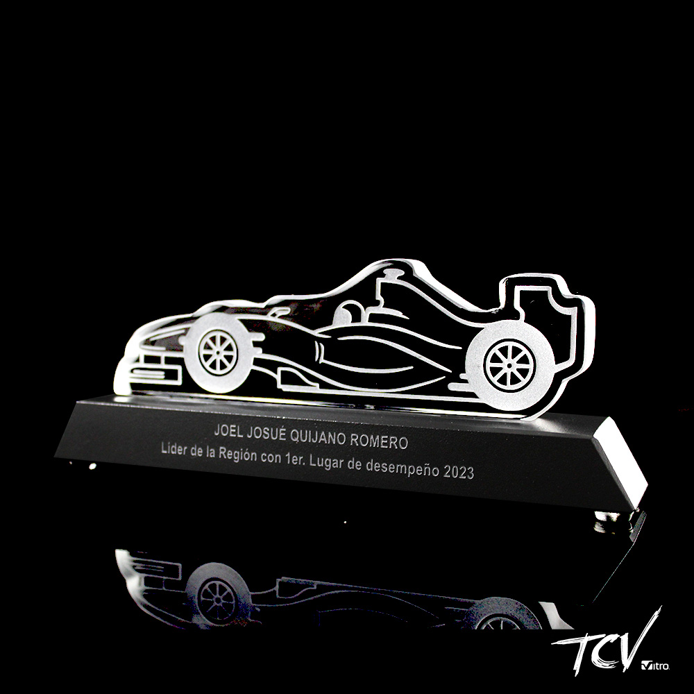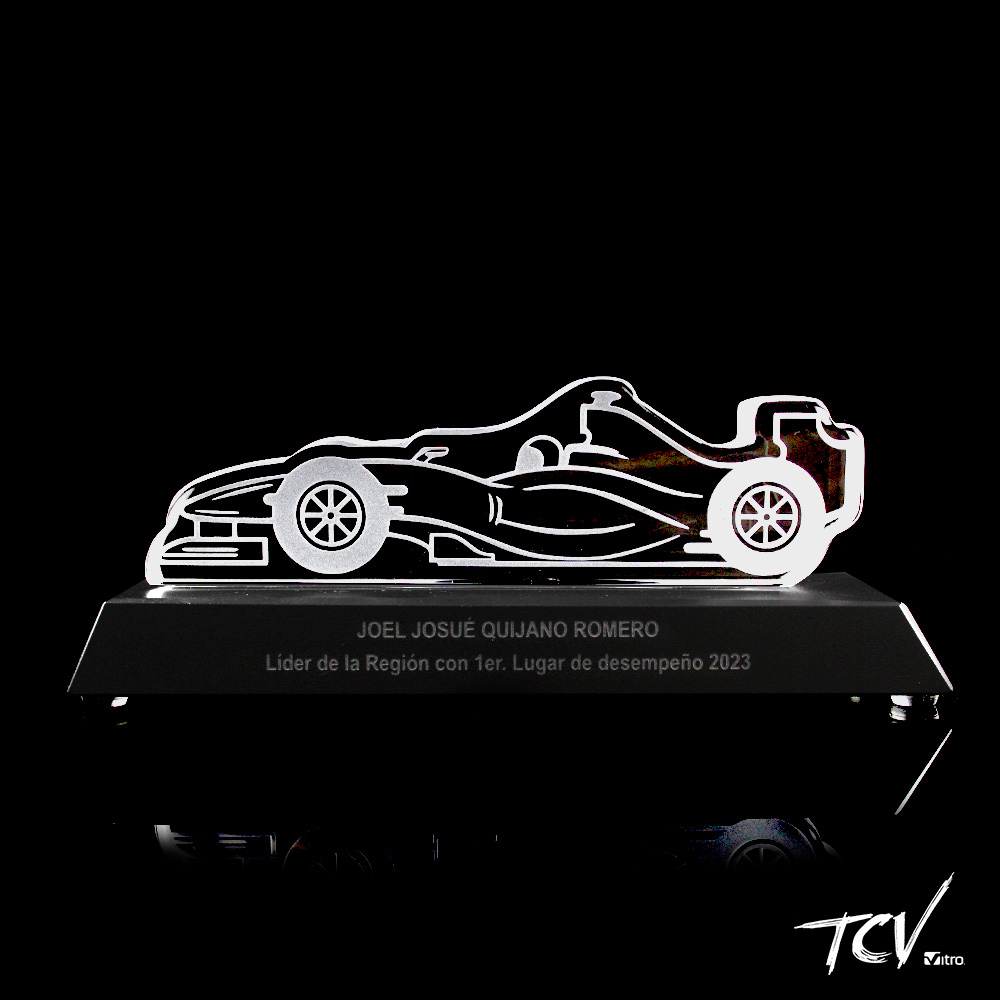 Silueta de cristal grabada al frente con cantos opacos sobre base de cristal negra.