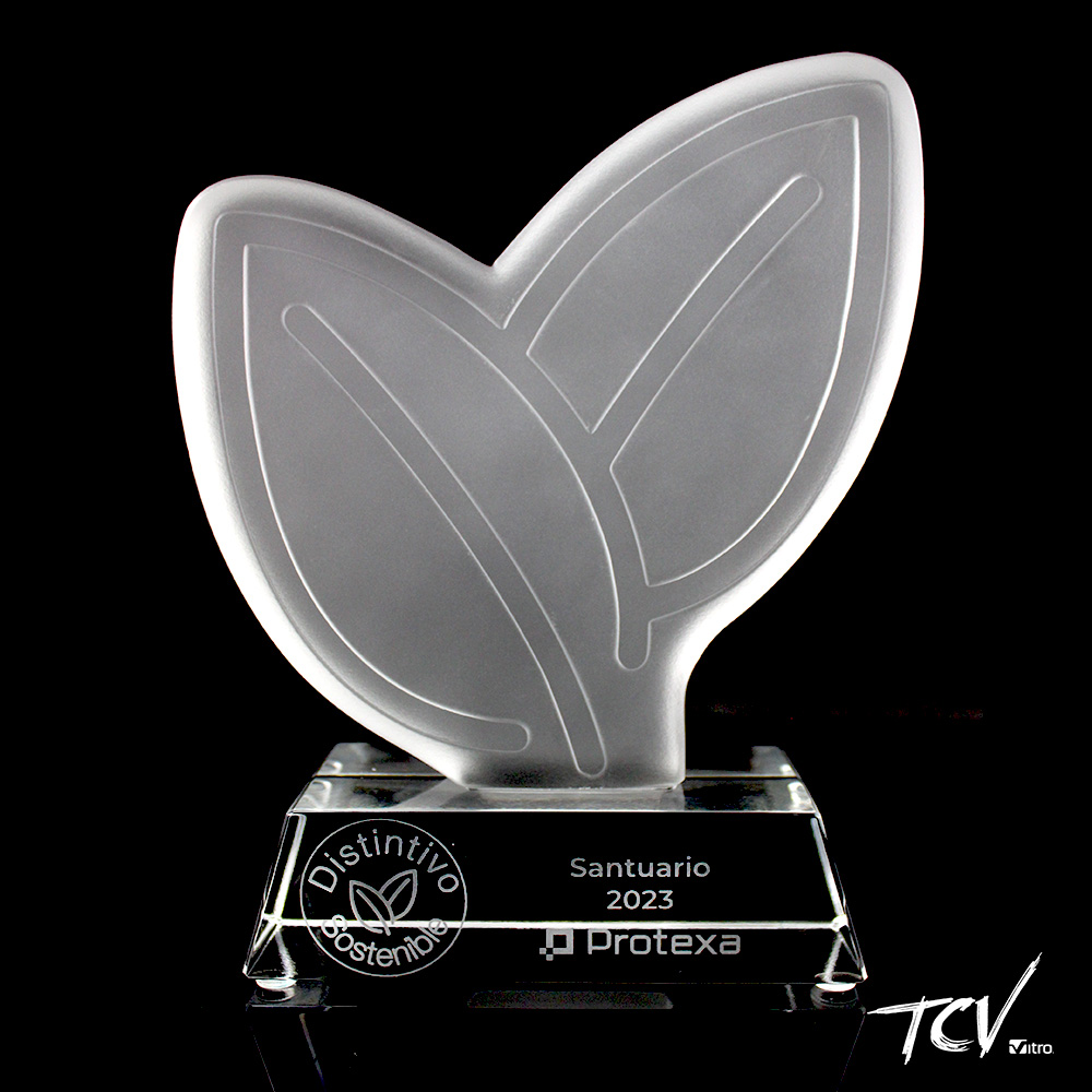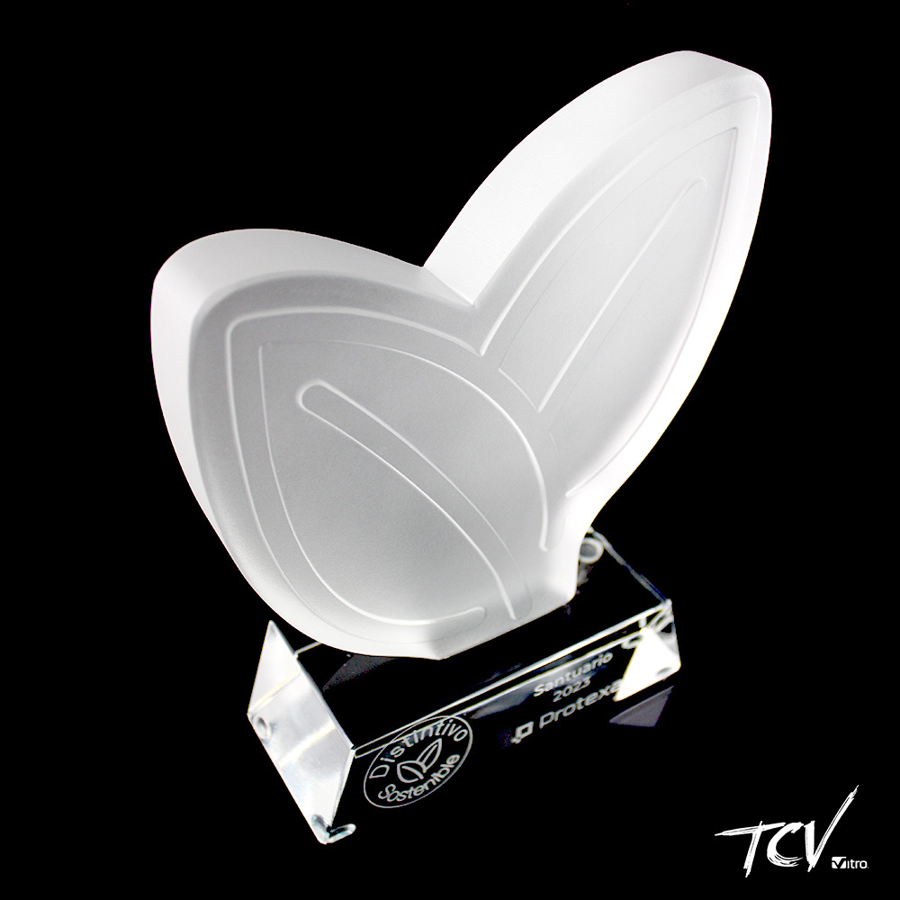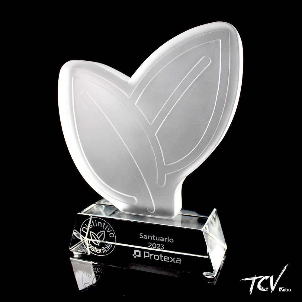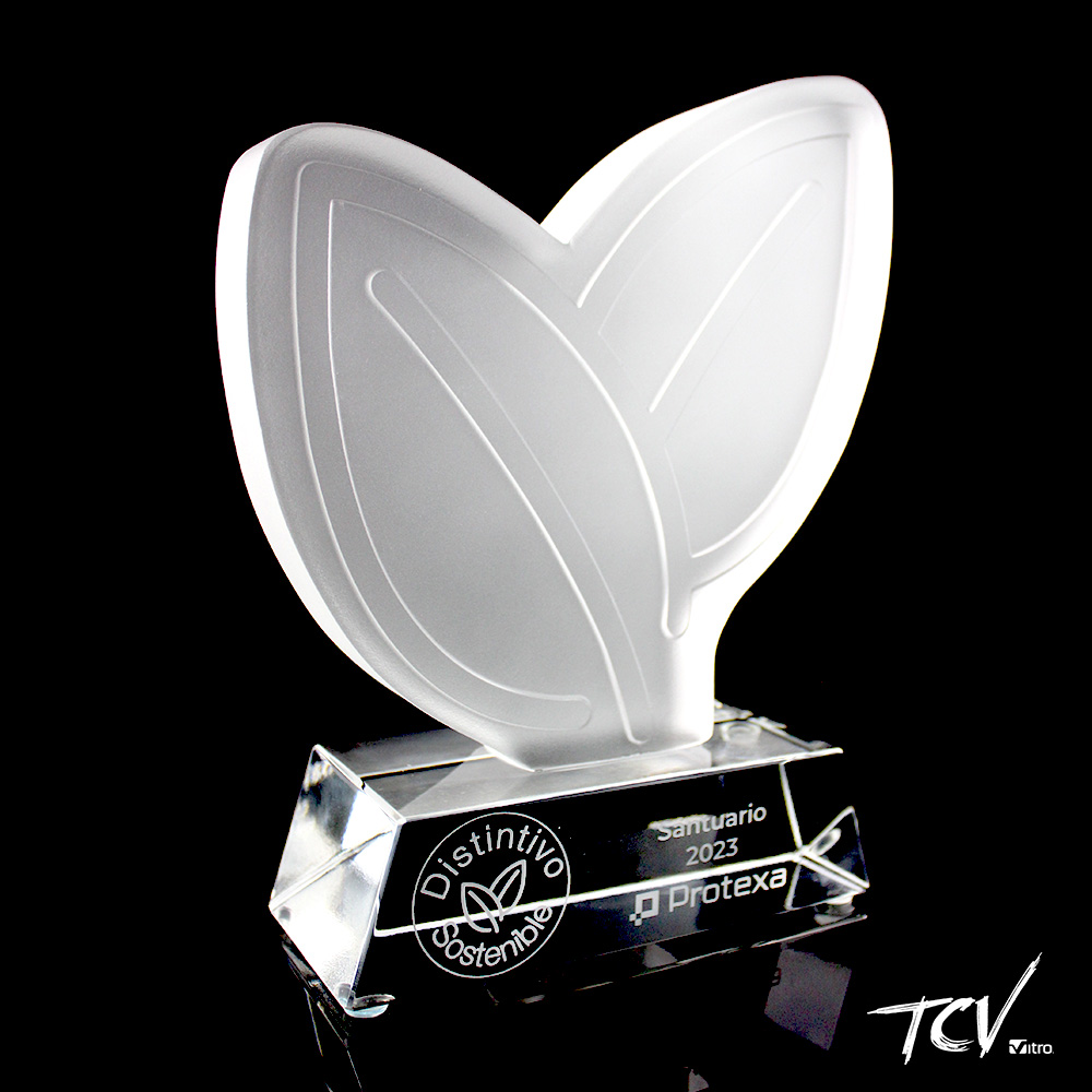 Pieza de cristal con pintura plateada grabado al frente sobre base piramidal de cristal.
