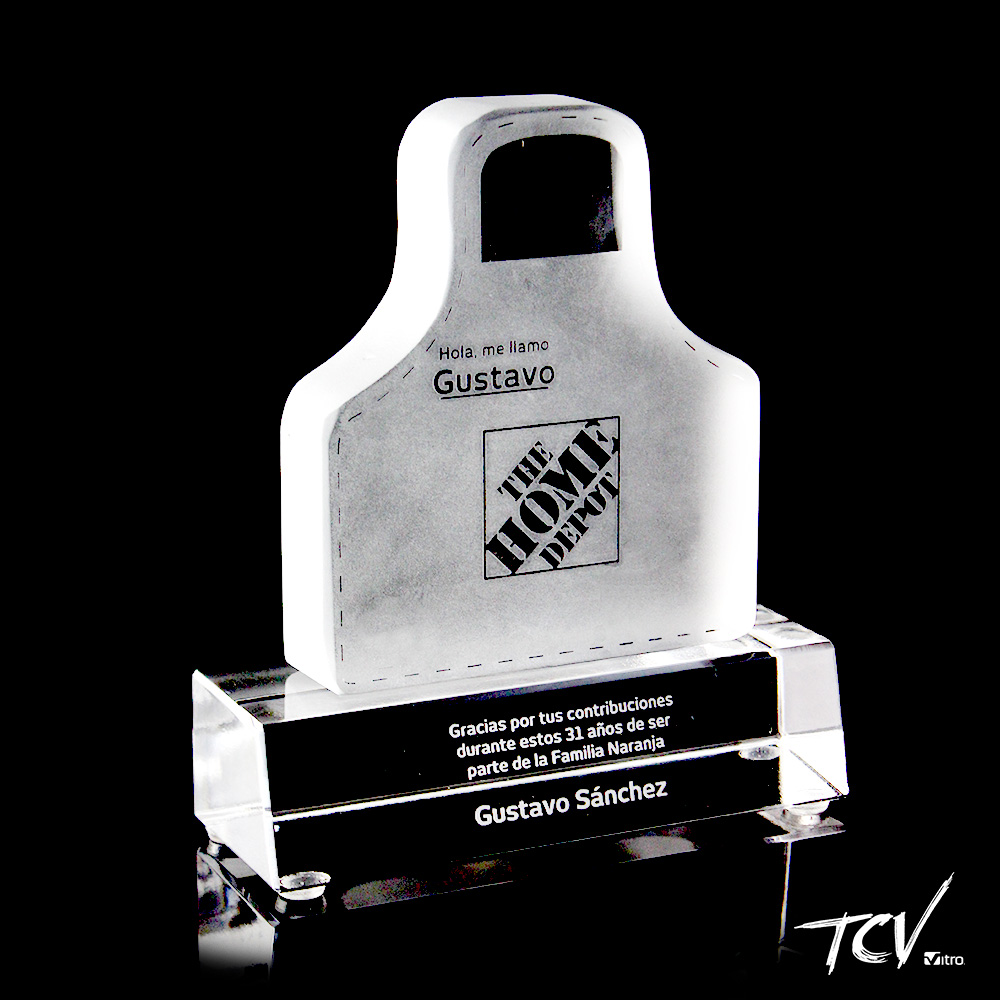 Silueta de cristal transparente acabado satinado grabado al frente en negativos sobre base de cristal transparente.