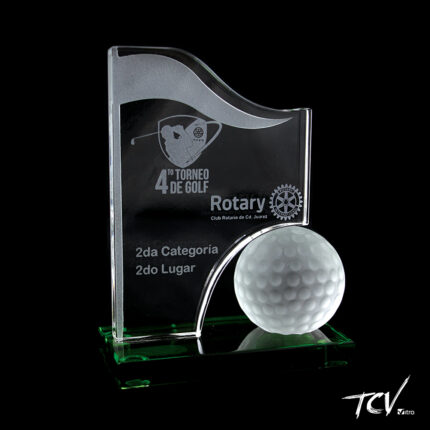 Trofeo de golf con preforma infinity door de inventario en la parte inferior y oblea de cristal con lente concavo en la parte posterior y grabado de pelota de tenis a traves de