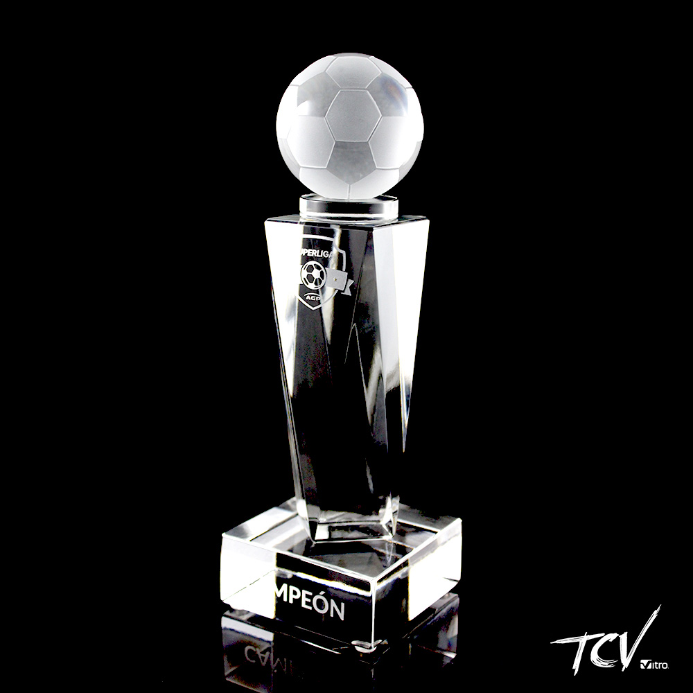 Esfera con grabado de balon de futbol sobre oblea en cristal verde y columna cristalina con facetas alrededor. Base rectangular en cristal verde pulido brillante.