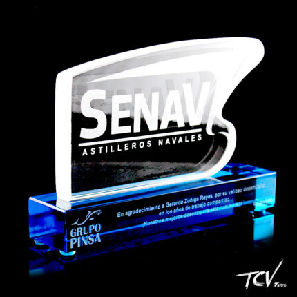 Silueta de cristal transparente grabado al frente con cantos opacos sobre base de cristal.