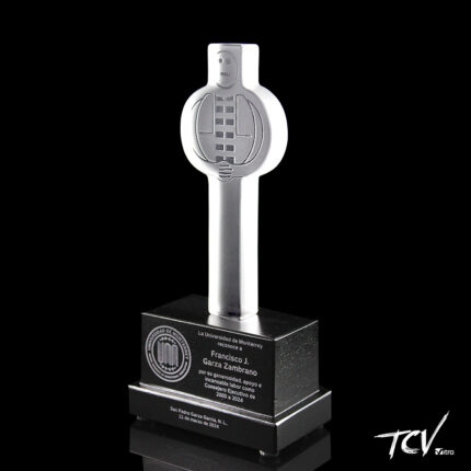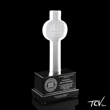 Pilares curvos que sostienen una oblea grabada a traves de con aplicacion de pintura verde que simboliza el resultado de esfuerzo y compromiso de la empresa (verde) y su equipo (cristalino) sobre una base en cristal negro satinado brillante facetada.